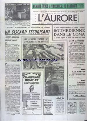 AURORE (L') [No 10633] du 22/11/1978 - GISCARD SECURISANT - LES ATROCES PHOTOS DE L'HOLOCAUSTE DE GUYANA - BOUMEDIENNE DANS LE COMA - LES CONFLITS SOCIAUX - LES SPORTS - BOXE - FOOT - Livres en ligne.