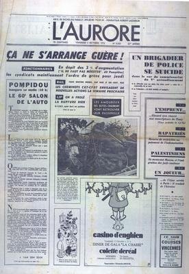 AURORE [No 9050] du 05/10/1973 - LES CONFLITS SOCIAUX - POMPIDOU AU SALON DE L'AUTO - LES AMOUREUX DES BUTTE-CHAUMONT VONT RETROUVER LEUR PASSERELLE - L'EMPRUNT ET GISCARD - PALESTINIENS - ILS MENACENT MOSCOU SI L'EMIGRATION DES JUIFS CONTINUE Livres en ligne.